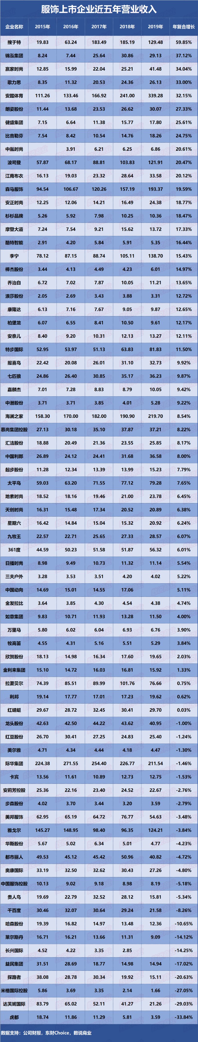 74家服饰上市企业近五年营业收入 制表:数说商业
