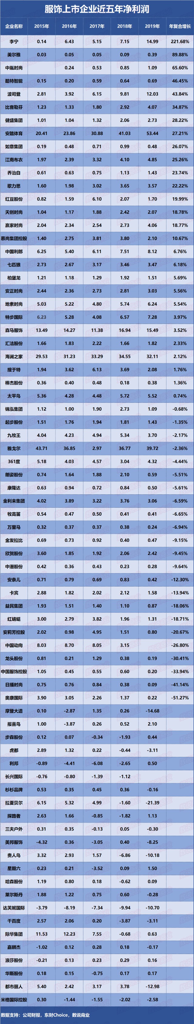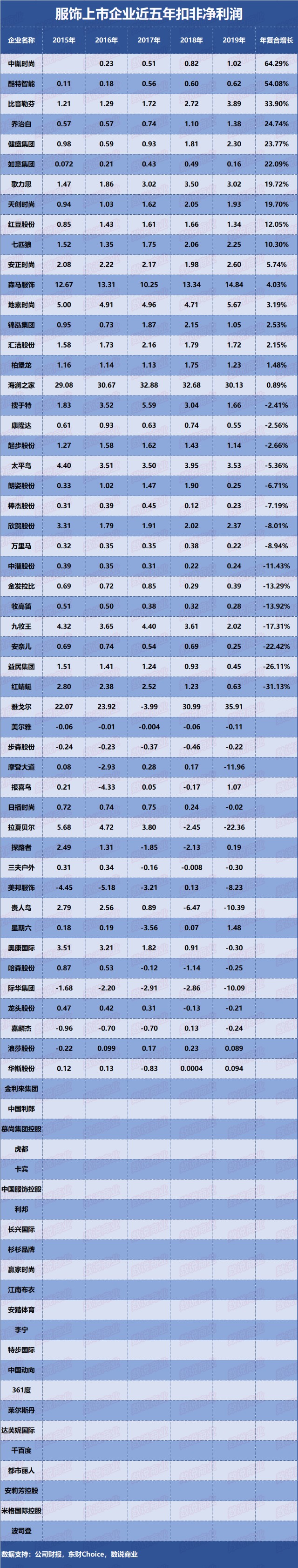 74家服饰上市企业近五年净利润 制表:数说商业