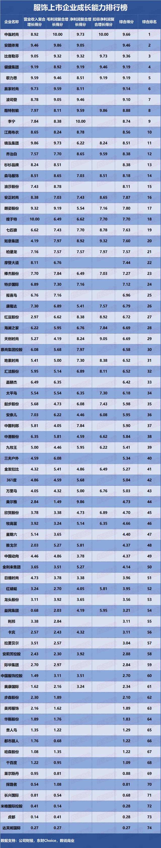 74家服饰上市企业成长能力排行榜